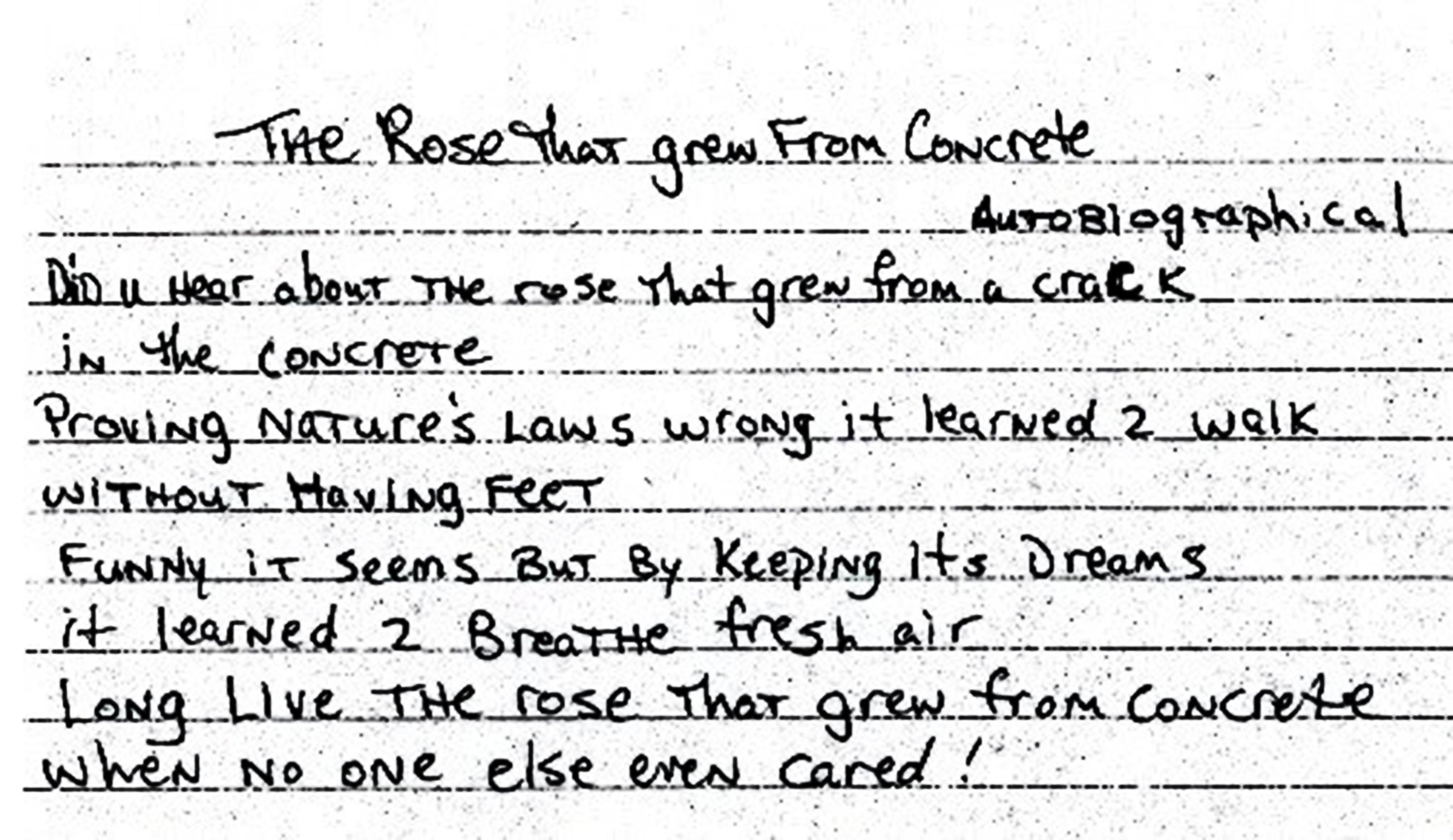 Word statement the rose that grew from concrete tattoo com from www. tattoo. com 37 concrete tattoos ranked in order of popularity and relevancy. The rose that grew from concrete (1999) is a collection of poetry written between 1989 and 1991 by tupac shakur, published by pocket books through its mtv books imprint. The rolling stone album guide. The rose that grew from concrete is a posthumous album based on the poetry/writings of tupac shakur, released on november 21, 2000. This album features a large cast of celebrities reading shakur's poetry and writing, much in the spirit of a traditional spoken word album. 2pac is featured on the song the rose that. When autocomplete results are available use up and down arrows to review and enter to select. Touch device users, explore by touch or with swipe gestures. As you read, take notes on how the speaker feels about the rose. Rose by georgereyes is licensed under cc by 2. 0. [1] did u hear about the rose that grew from a crack. Proving nature’s laws wrong it learned 2 walk. [5] funny it seems but by keeping its dreams. The rose that grew from concrete.