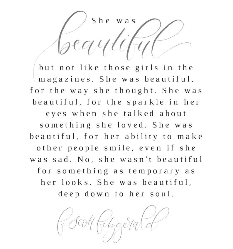 She was beautiful, but not like those girls in the magazines. She was beautiful, for the way she thought. She was beautiful, for the sparkle in her eyes when she talked about something she loved. She was beautiful, for her ability to make other people smile, even if she was sad. No, she wasn't beautiful for something as temporary as her looks. She was beautiful, deep down to her soul. She is beautiful. A quote from, F. Scott Fitzgerald